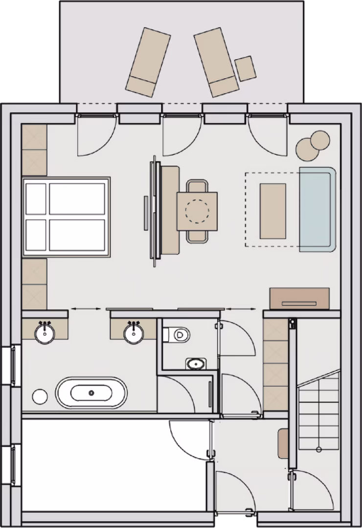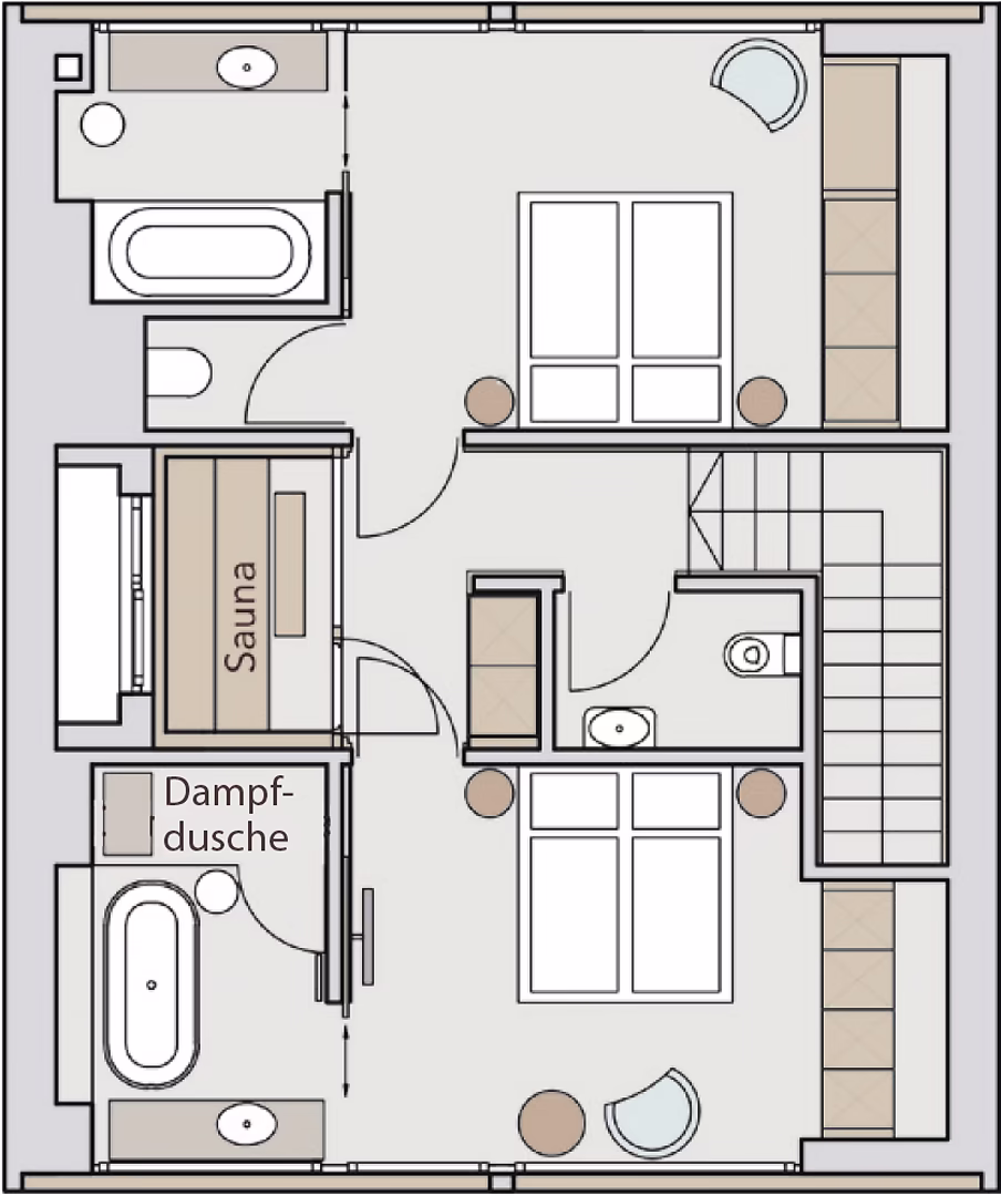- 2 Schlafzimmer mit eigenen Badezimmern und Sauna in der oberen Etage